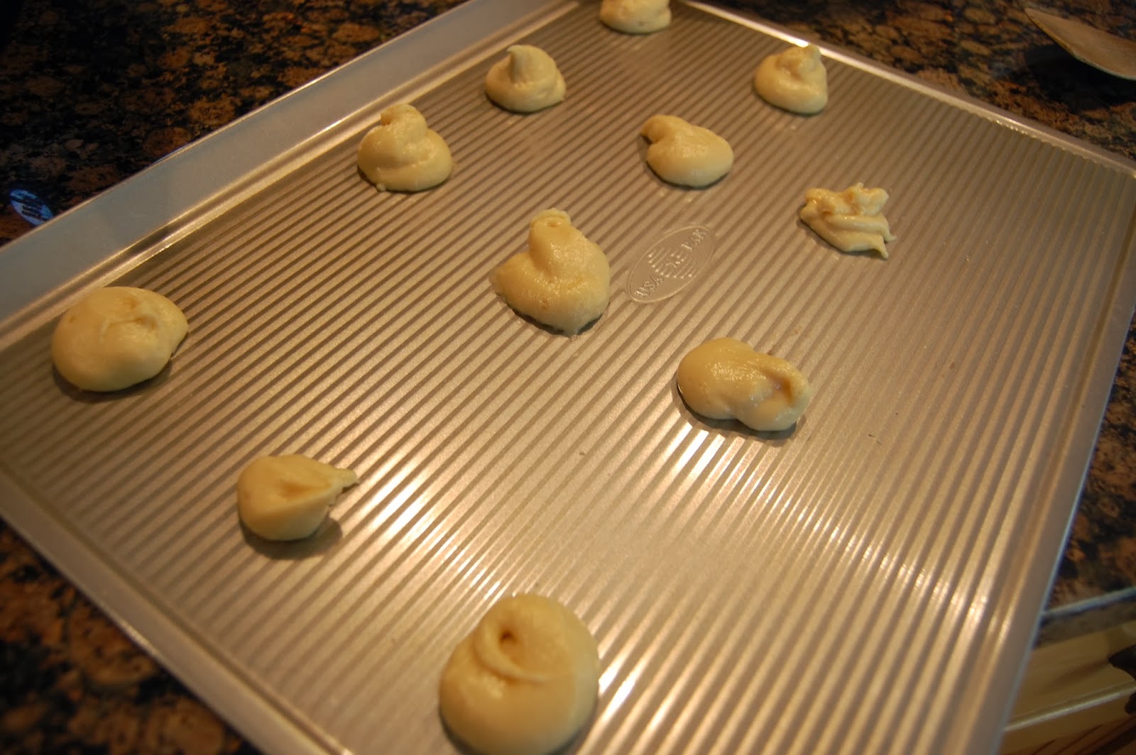 Now, I assume you could use melon ballers or just spoons to scoop out relatively even portions of the dough, but I (foolishly) decided to go the ambitious route and use a makeshift piping bag as the recipe suggested you do. I, personally, would not recommend this at all. The dough is really thick and sticky at this point, and it was difficult to get it all to come out of the bag. I feel like I ended up wasting at least three or so cookie's worth, and since mine ended up being on the big side anyway, it definitely affected the number of cookies I was ultimately able to make.